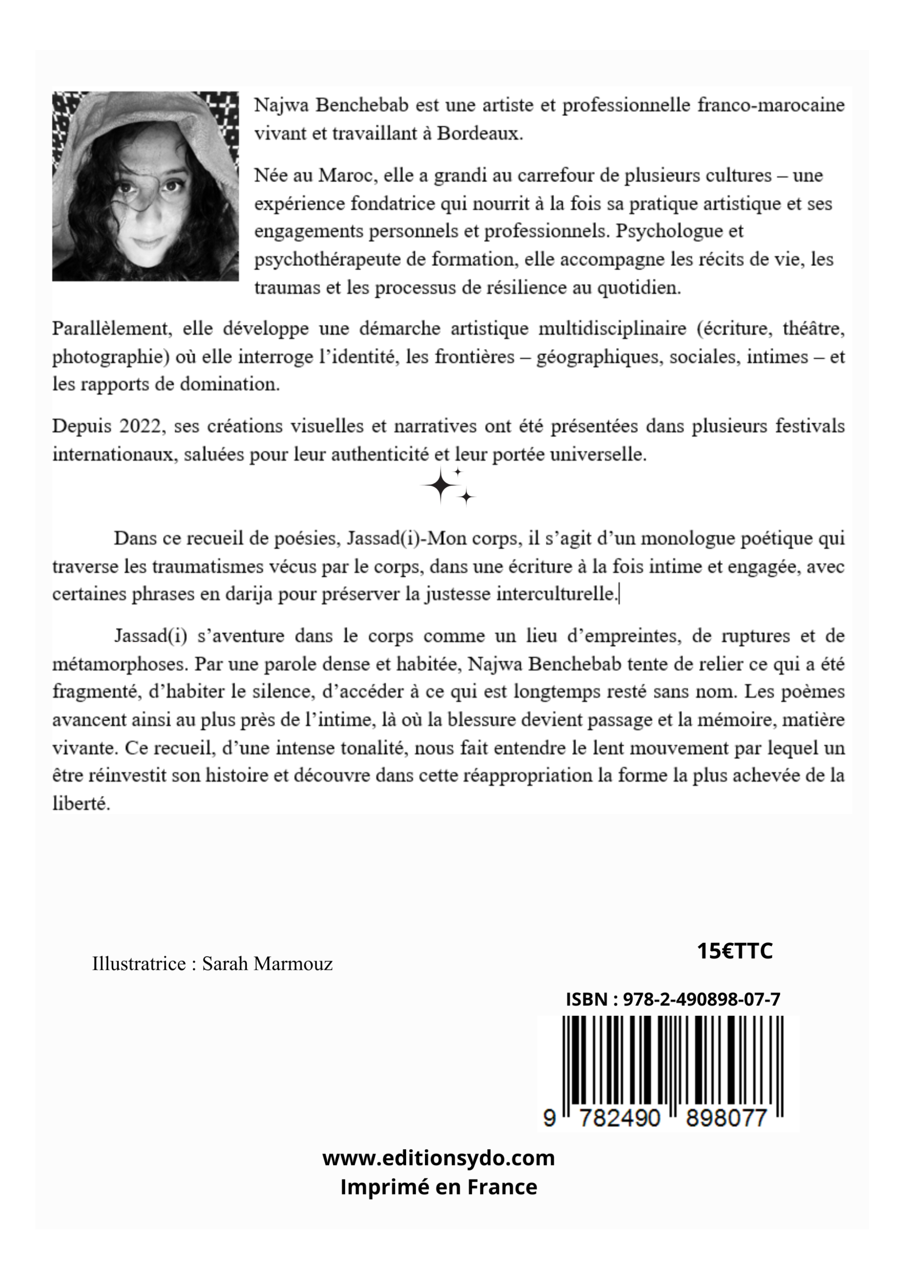 Dans Jassad(i) – « mon corps » – il ne s’agit pas simplement d’un recueil de poésies, mais d’un long souffle intérieur. Un monologue traversé par les cicatrices invisibles, les héritages culturels, les blessures tues et les renaissances possibles. Le corps y apparaît comme archive vivante : il garde, absorbe, transforme. Il porte les traces des ruptures, mais aussi les germes d’une métamorphose.